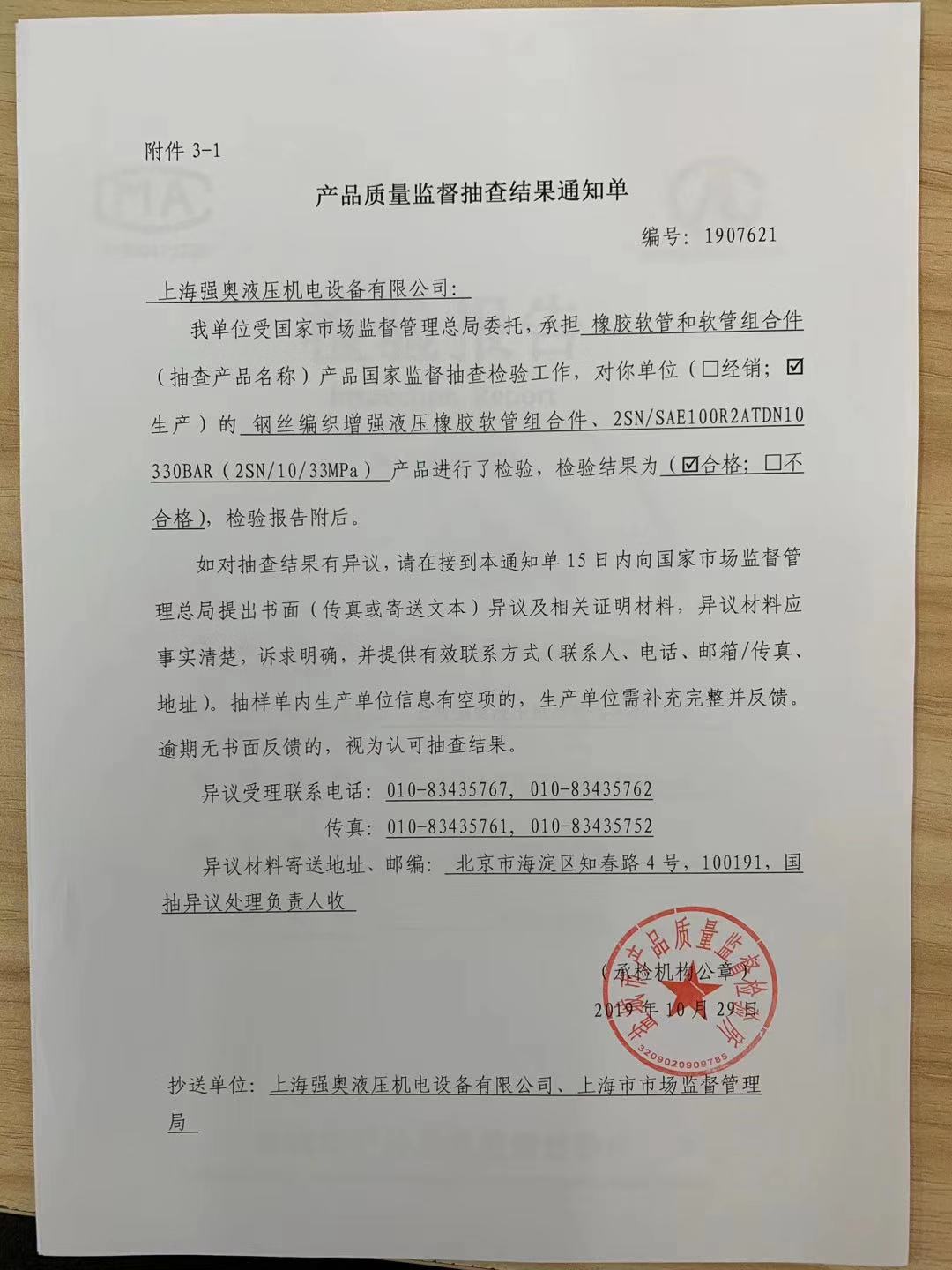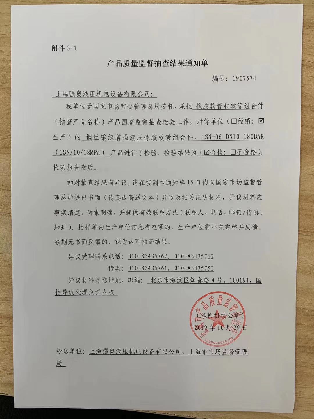 熱烈祝賀 上海強(qiáng)奧液壓機(jī)電設(shè)備有限公司 于2019年10月29日順利通過 國家市場監(jiān)督管理局 對我司2個(gè)批次的產(chǎn)品質(zhì)量監(jiān)督抽查!
